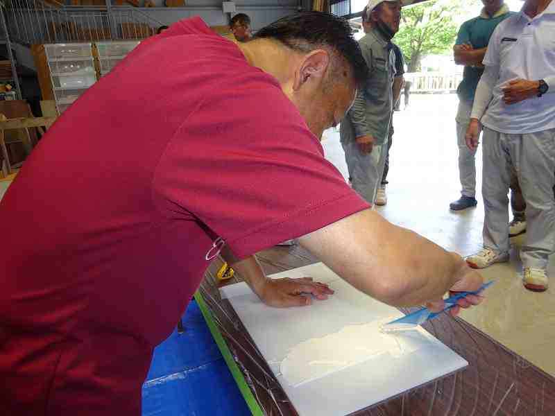 R7年6月21日(土) 材料講習会を開催いたしました 今年の講習内容は 黒崎産業㈱ 木塗り壁 アイカ工業㈱ ジョリパット爽土です